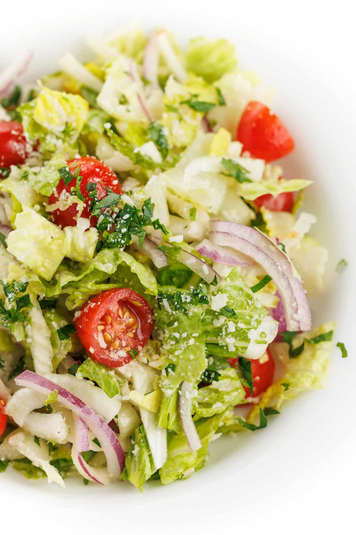 You can’t go wrong with a simple salad as a side for your dinner table. This Italian Garden Salad with Fennel uses simple, accessible ingredients, but if you aren’t familiar with fennel, it adds crunch, texture, and fiber! Slightly sweet like licorice and crunchy like celery, it adds a mild anise flavor that pairs perfectly with the sweet tomatoes and spicy red onions. I love drizzling with a lemony parmesan vinaigrette that can we whipped up quickly, but a store-bought Italian dressing would work well, too!