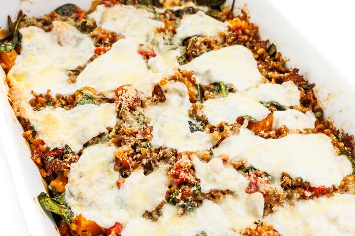 This Italian Sausage and Butternut Squash Farro Bake is hearty and comforting, made with nutty farro, spicy sausage, creamy butternut squash, and two types of mozzarella cheese.