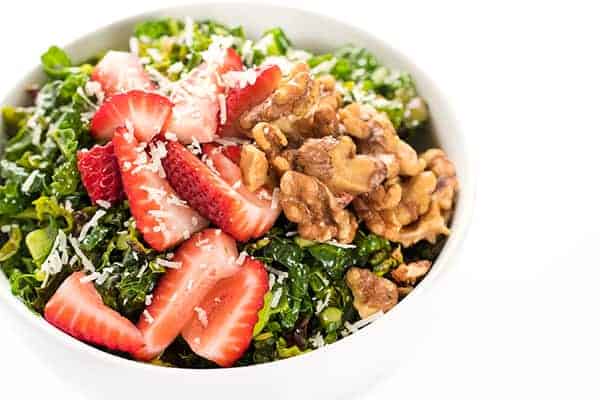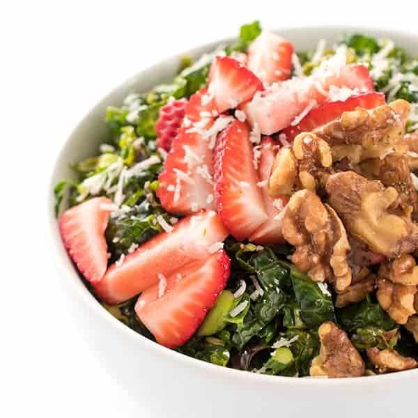 This massaged kale salad is made with juicy strawberries, toasted walnuts and nutty Parmesan cheese.