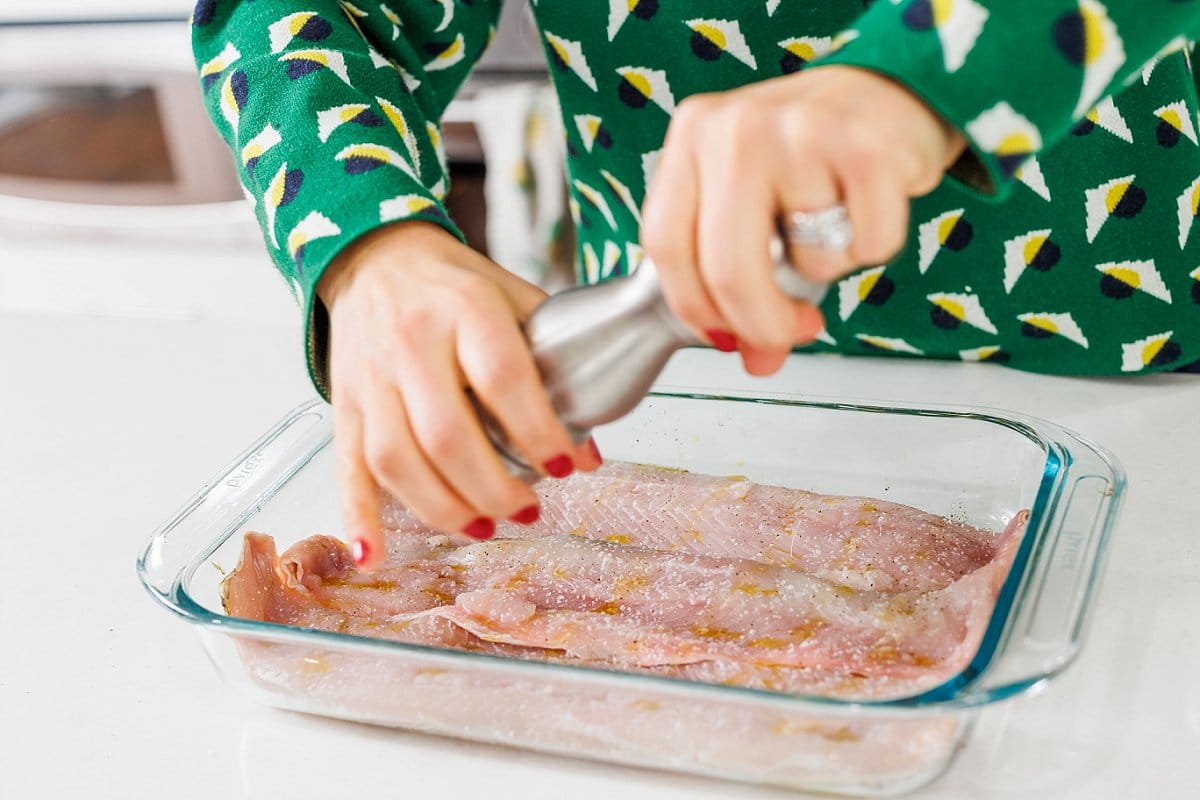 Start by cooking your fish. Pat them dry, and lay the fillets in a flat layer in a prepared baking dish.