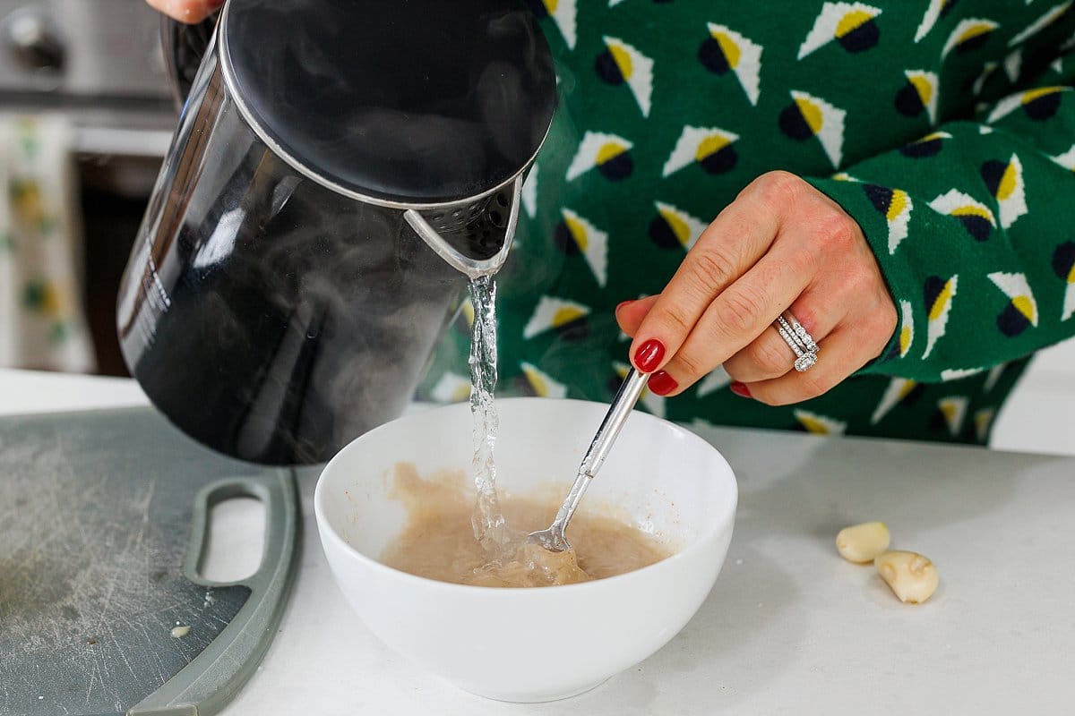 While the fish is baking, make your tahini sauce. Start by freshly grating your garlic into a small bowl.