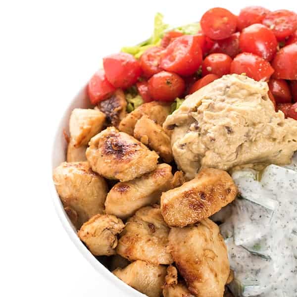 This hearty Lebanese-inspired protein bowl is packed with lemony chicken tawook, creamy cucumber yogurt sauce and hummus.