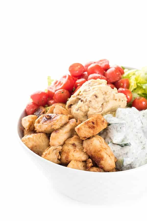 - To assemble, fill each bowl with two cups of romaine and a half cup of cooked grains (if using.) Top with one serving each of the chicken and cucumber Laban. Finally, top with two tablespoons of hummus and 1/4 cup of the tomato mixture. Serve with extra lemons for squeezing before eating!