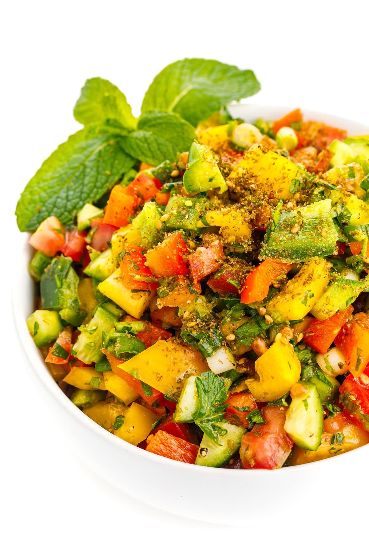 Tomatoes, cucumbers, peppers, and scallions are tossed with parsley, za’atar, lemon and olive oil in this fresh and healthy Lebanese Chopped Salad recipe.