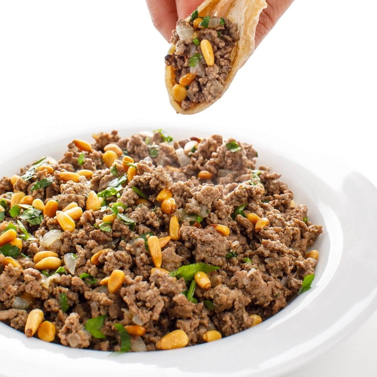 Lebanese Hushwee (or hashweh) is a simple, modest Middle-Eastern recipe made with ground meat, cinnamon, and toasted pine nuts. Every family has a staple, comfort food that they go to over and over. For my family? That’s Lebanese Hushwee or Ground Beef with Pine Nuts with a side of lebanese green beans. Packed full of flavor, but done quickly, we use it in a handful of different dishes, but also enjoy it on it’s own!
