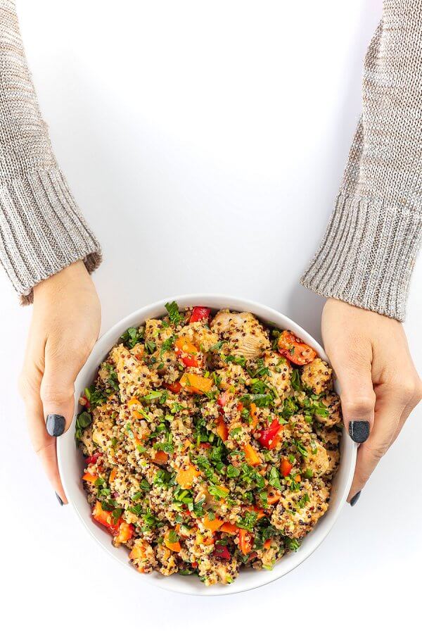 This protein-packed quinoa salad is filled with tender chunks of Lebanese Shish Tawook Chicken, crisp veggies, and fresh herbs then tossed with lemon and olive oil.