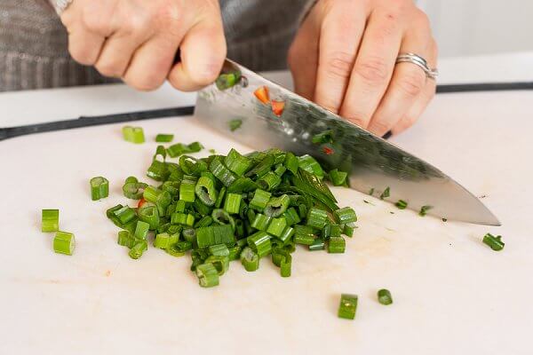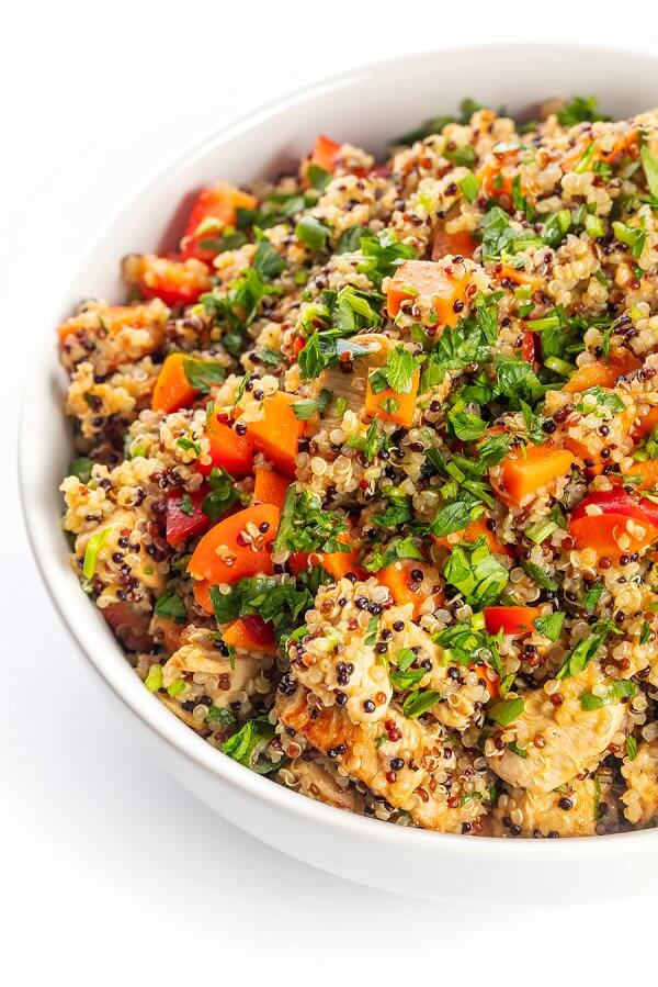 For this Lebanese Quinoa Salad, I toss together cooked quinoa with Shish Tawook Chicken, carrots, peppers, scallions, and parsley.