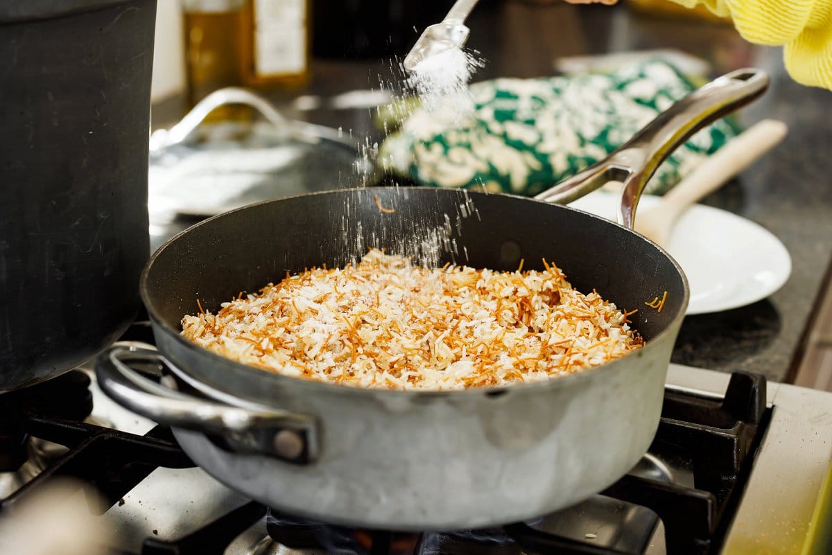 - Add rinsed rice to the pan and stir into the vermicelli and butter. Toast the rice for 2-3 minutes, stirring frequently.