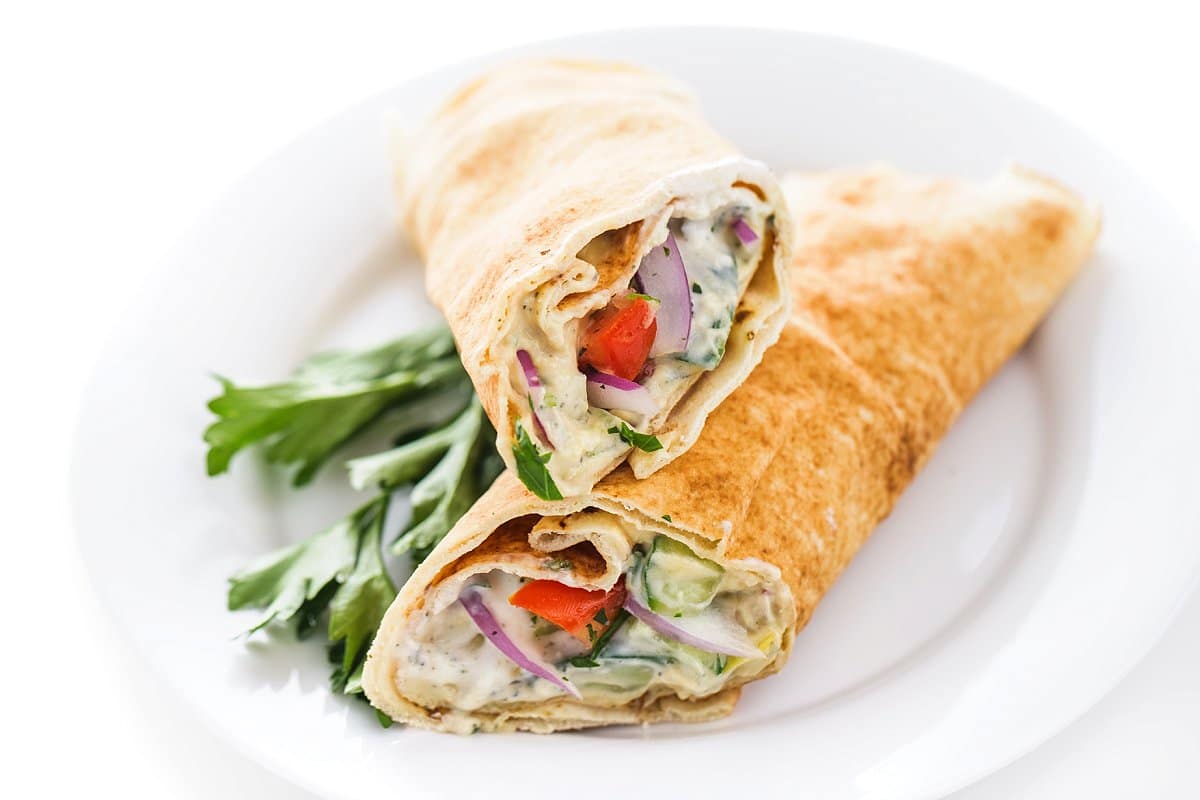 These Lebanese salad wraps are made with protein-packed hummus and creamy cucumber yogurt sauce. If you’re looking for new vegetarian lunch ideas, this recipe is for you.