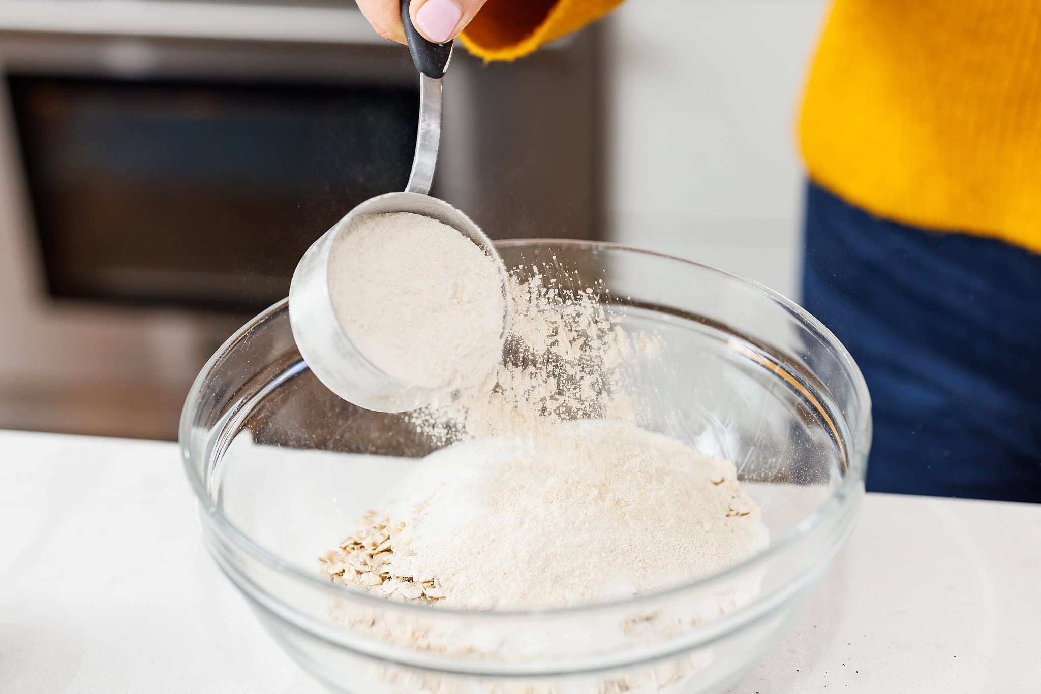 Next, you’ll mix your dry ingredients together. First you’ll measure out your white flour.