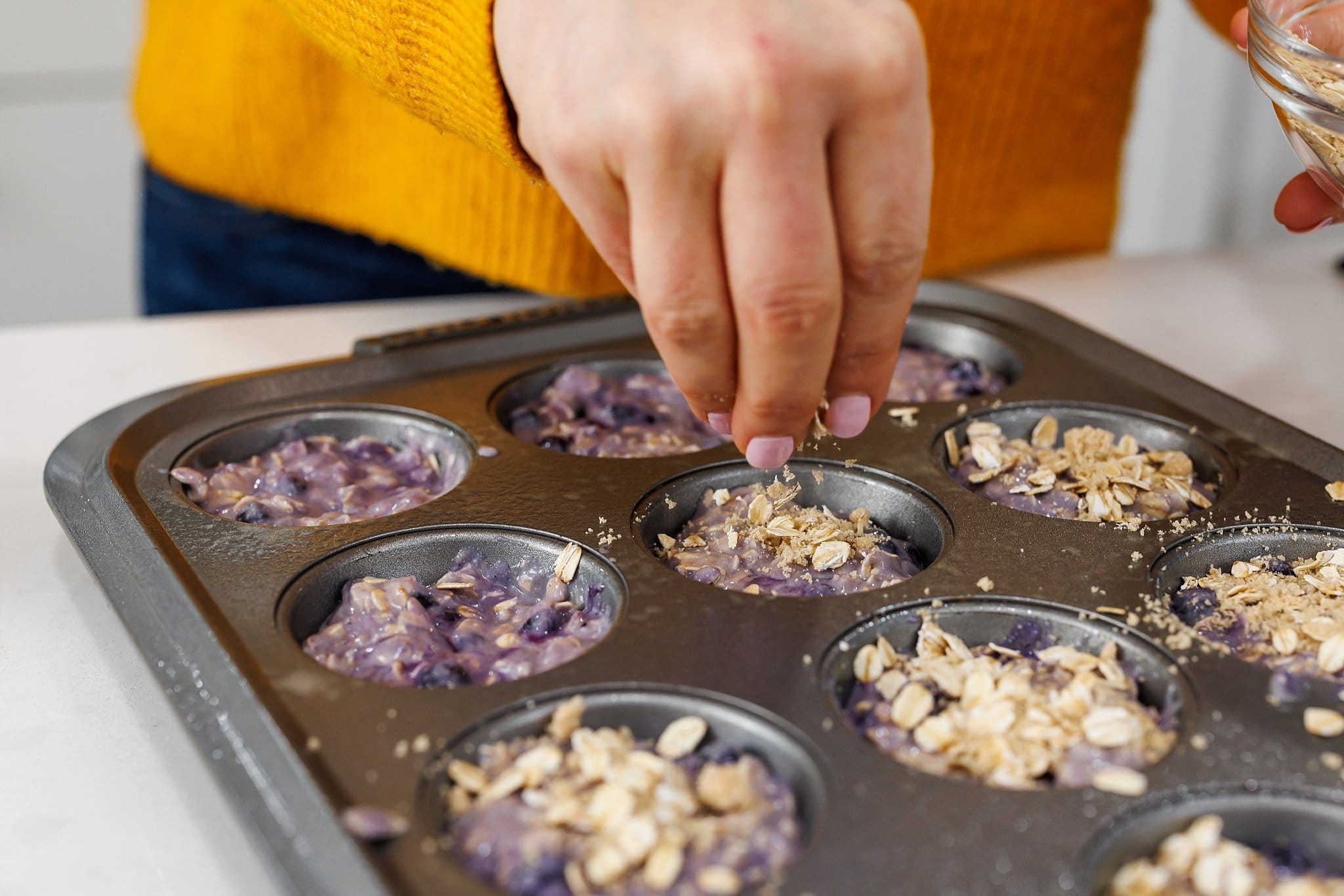 Top each muffin with a bit of the oat and sugar mixture you made in the beginning.