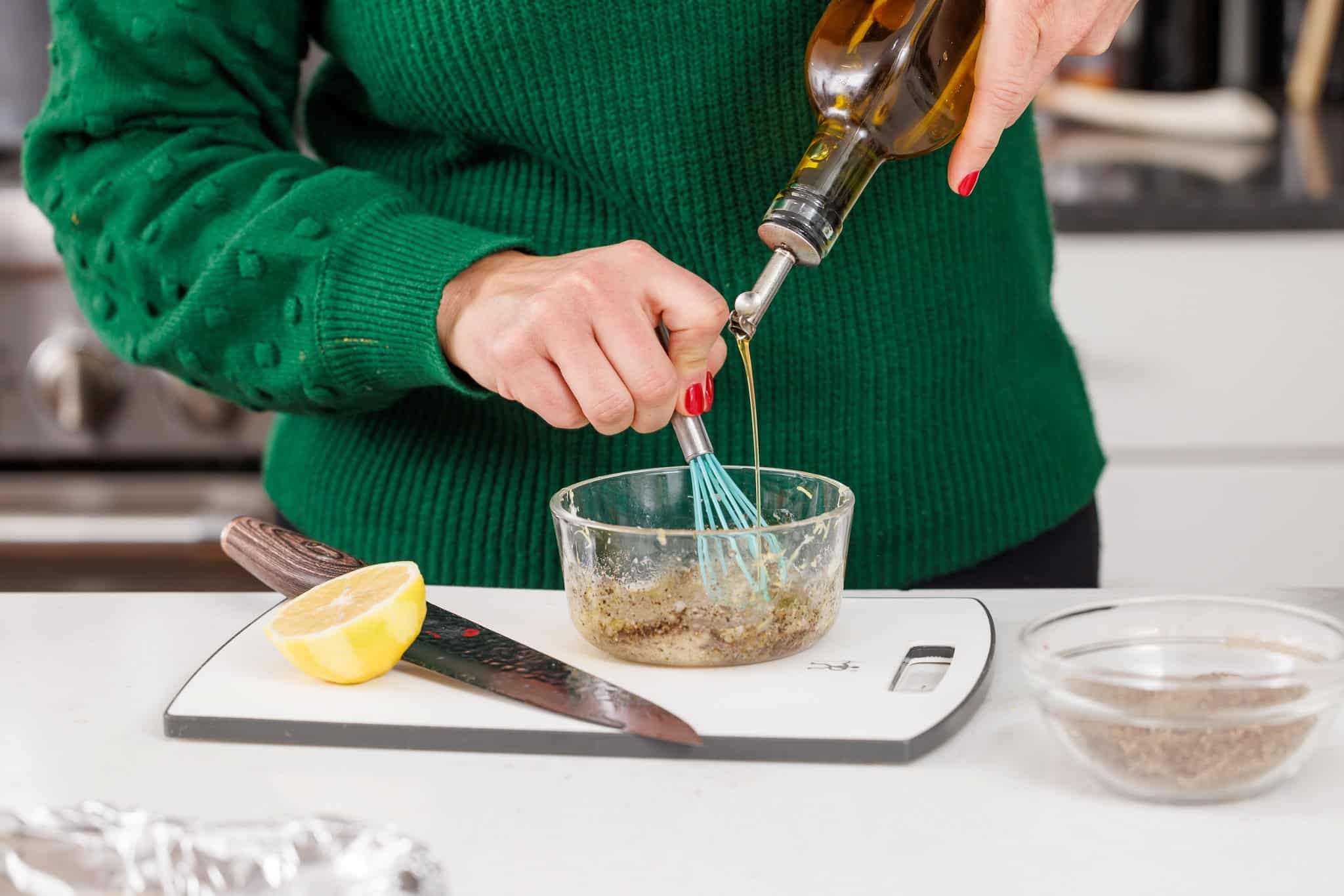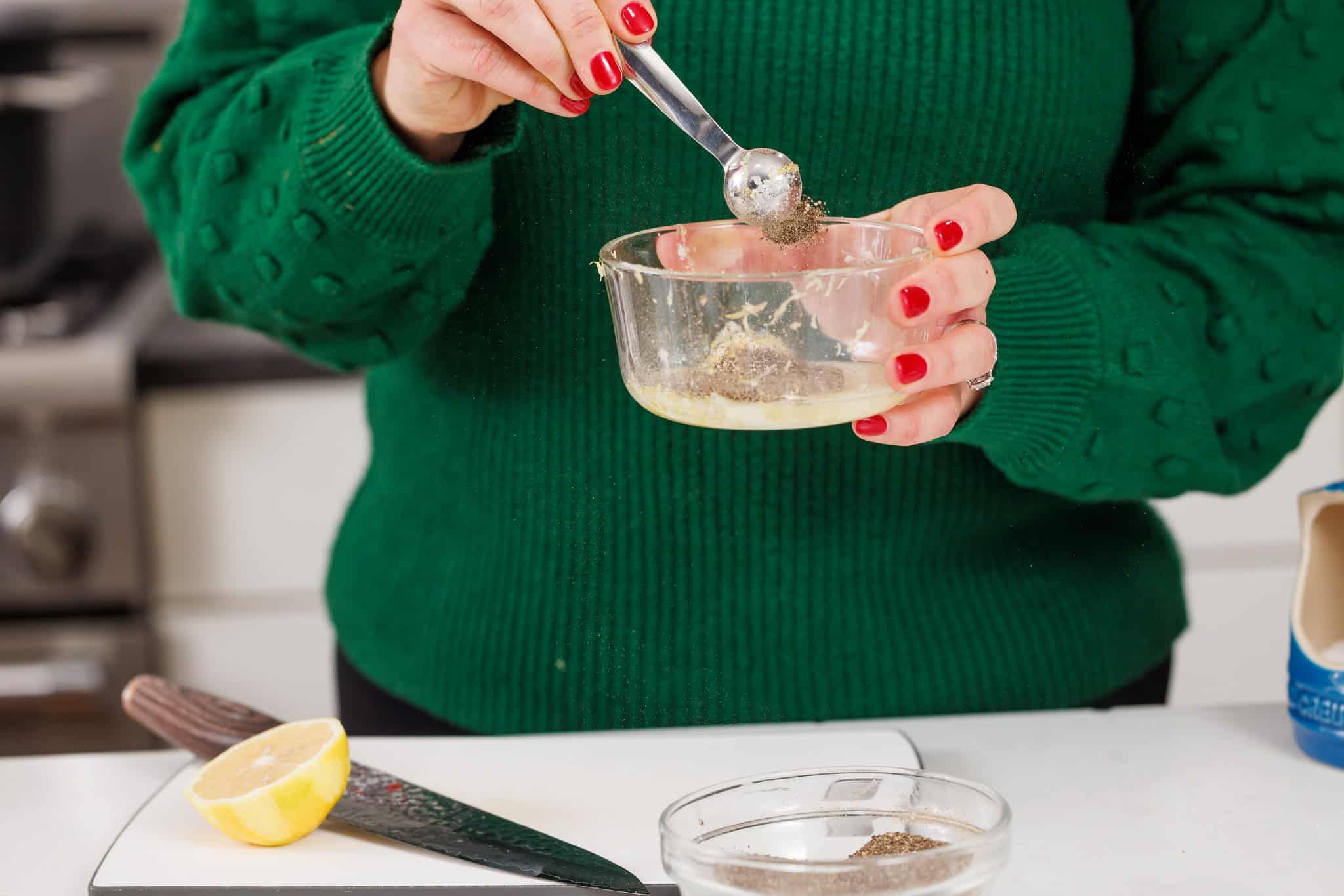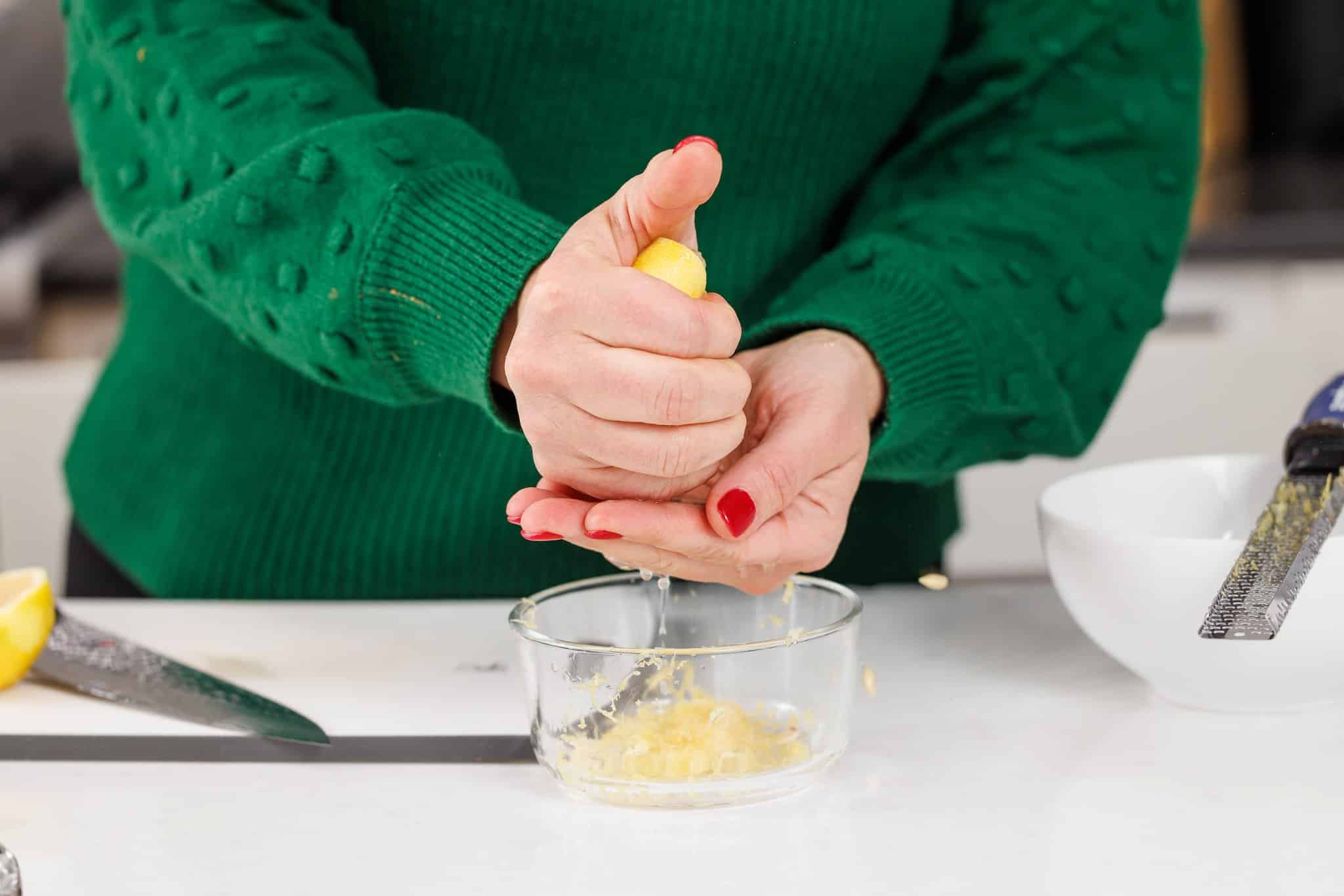 Make sure you zest your lemon first, as it’s significantly easier, then cut it in half and juice it into the bowl, catching any seeds.