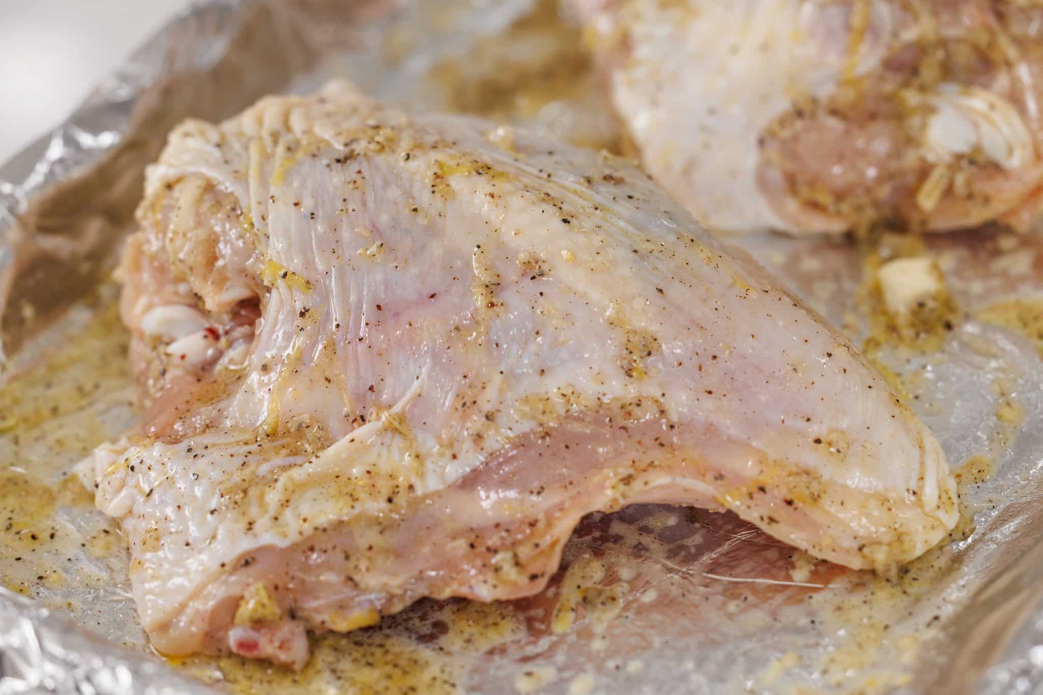 Then take your chicken breasts that have been patted dry, and brush your lemon pepper mixture on both sides of each breast.