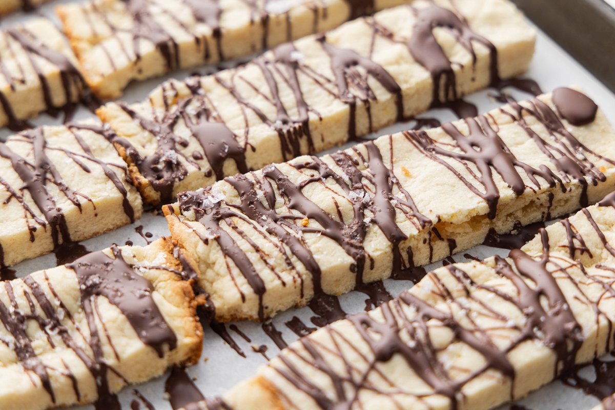 Bright and buttery lemon shortbread cookies drizzled with salted chocolate is an easy, bite-sized dessert that’s perfect for coffee breaks, hostess gifts, or any special occasion.