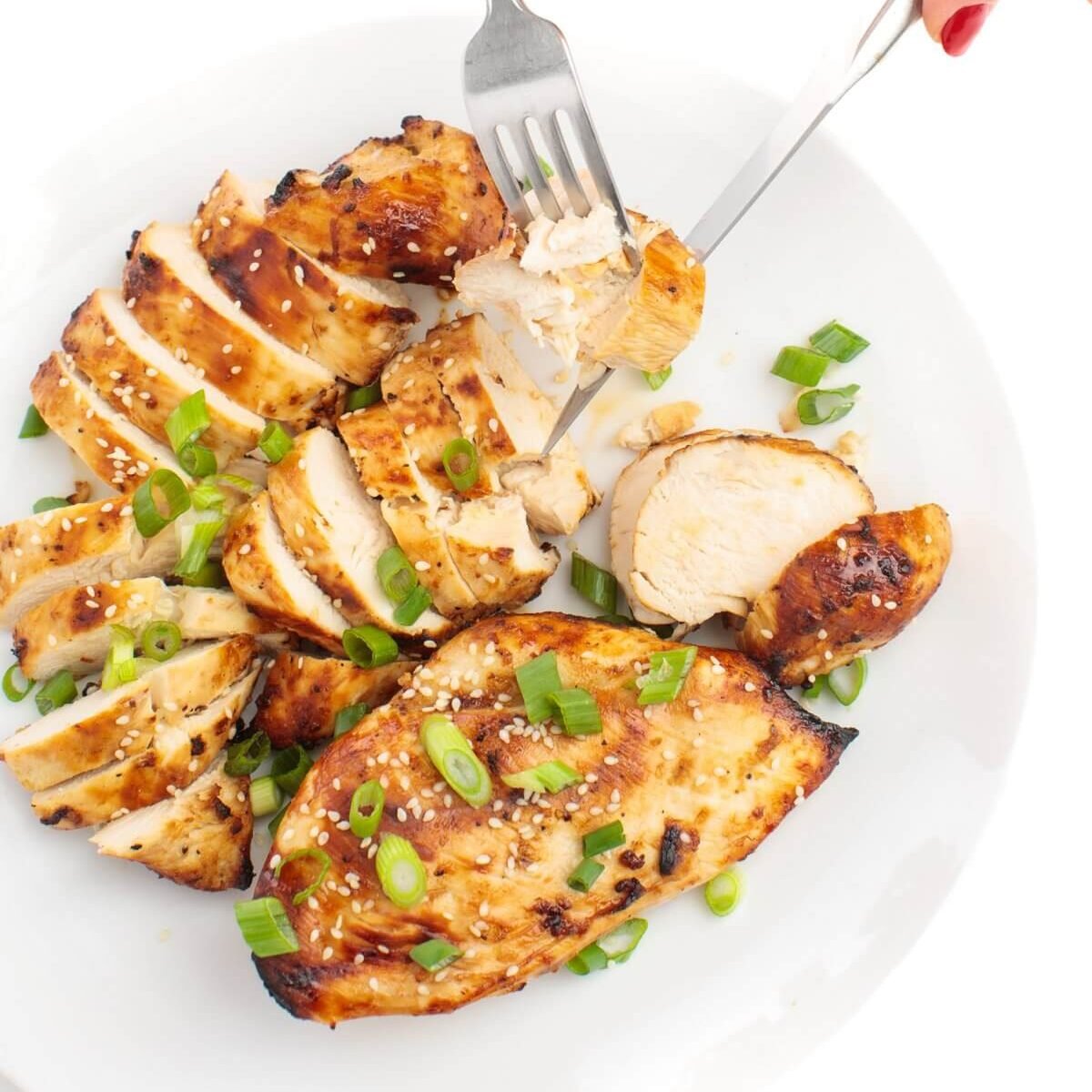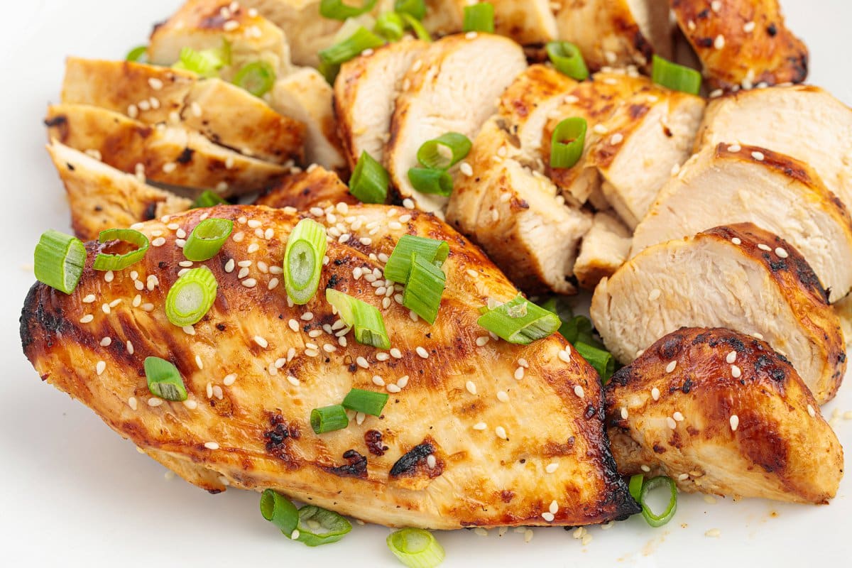 When chicken has reached an internal temp of 165 on a meat thermometer, you can remove it from the grill or oven. Garnish with some fresh scallions or sesame seeds, serve, and enjoy your Lemon Soy Marinated Chicken Breasts!