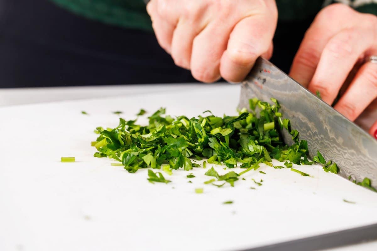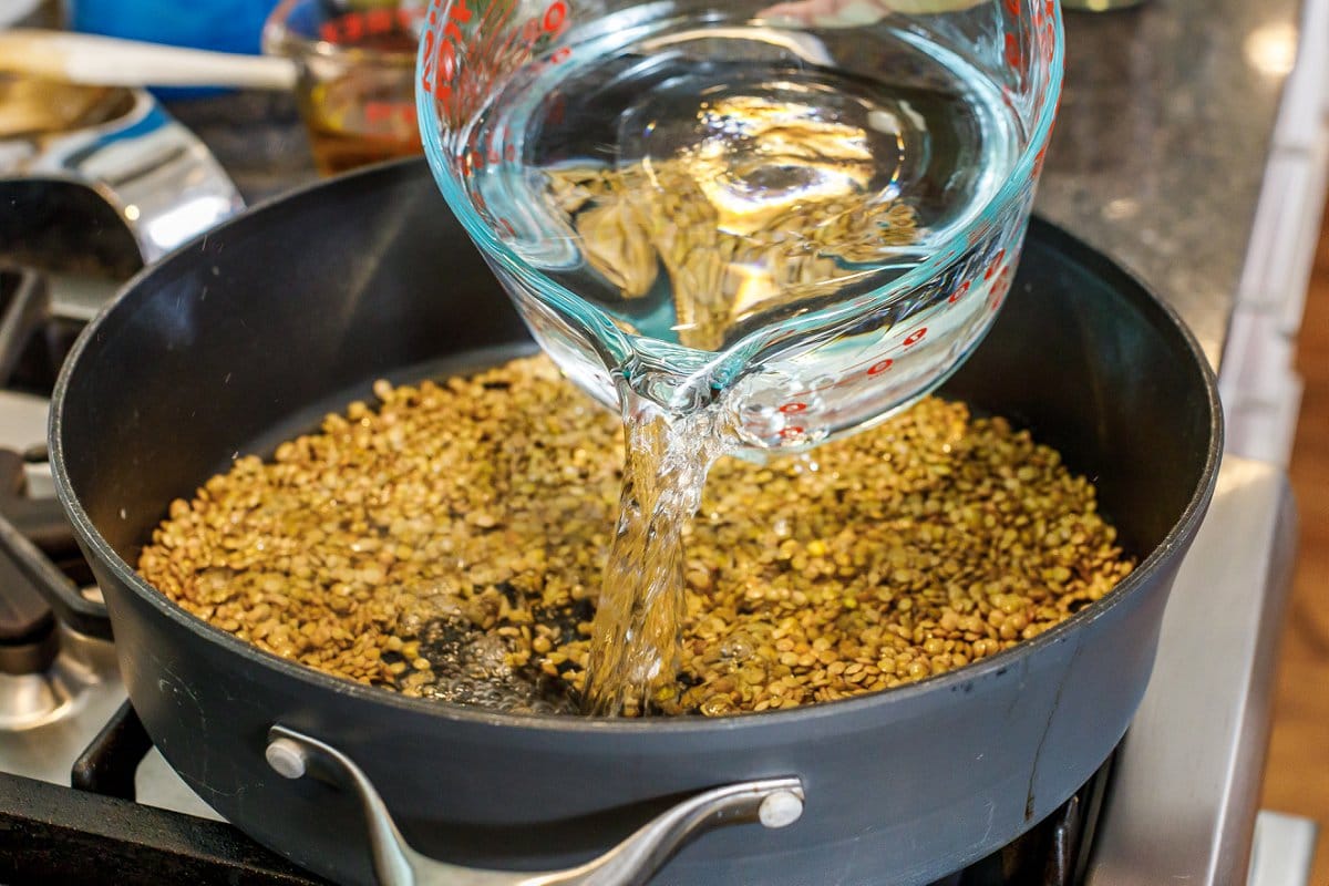While lentils are cooking, dice your vegetables and mince your onion, parsley, or other fresh herbs.