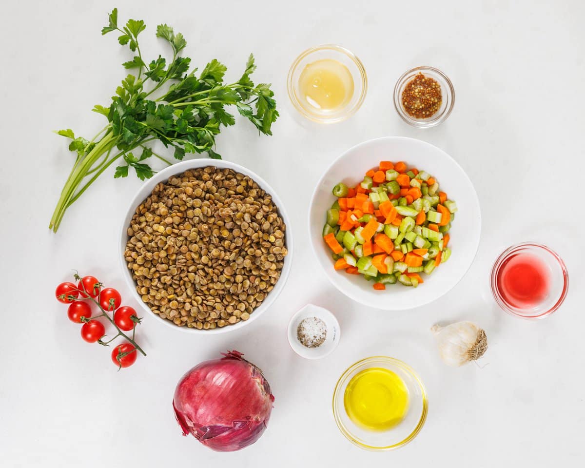 This flavorful lentil salad with red wine vinaigrette is filled with veggies and protein-packed, ideal for a make-ahead lunch or a busy weeknight side dish.