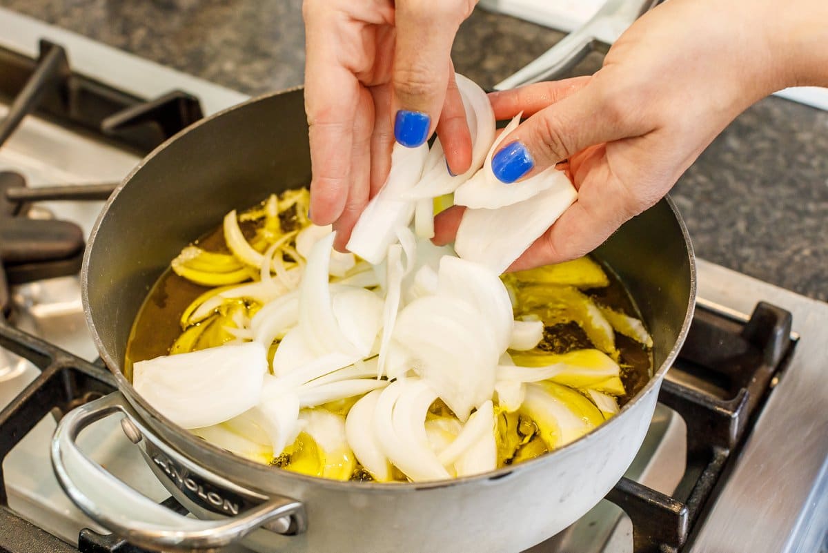 - In a large pot, heat olive oil over medium high heat and add the onion slices. Cook for 45 minutes, stirring frequently, until brown and caramelized. If they begin to burn, reduce heat to medium or even medium-low. Keep them moving! Remove onions from pan and set aside.