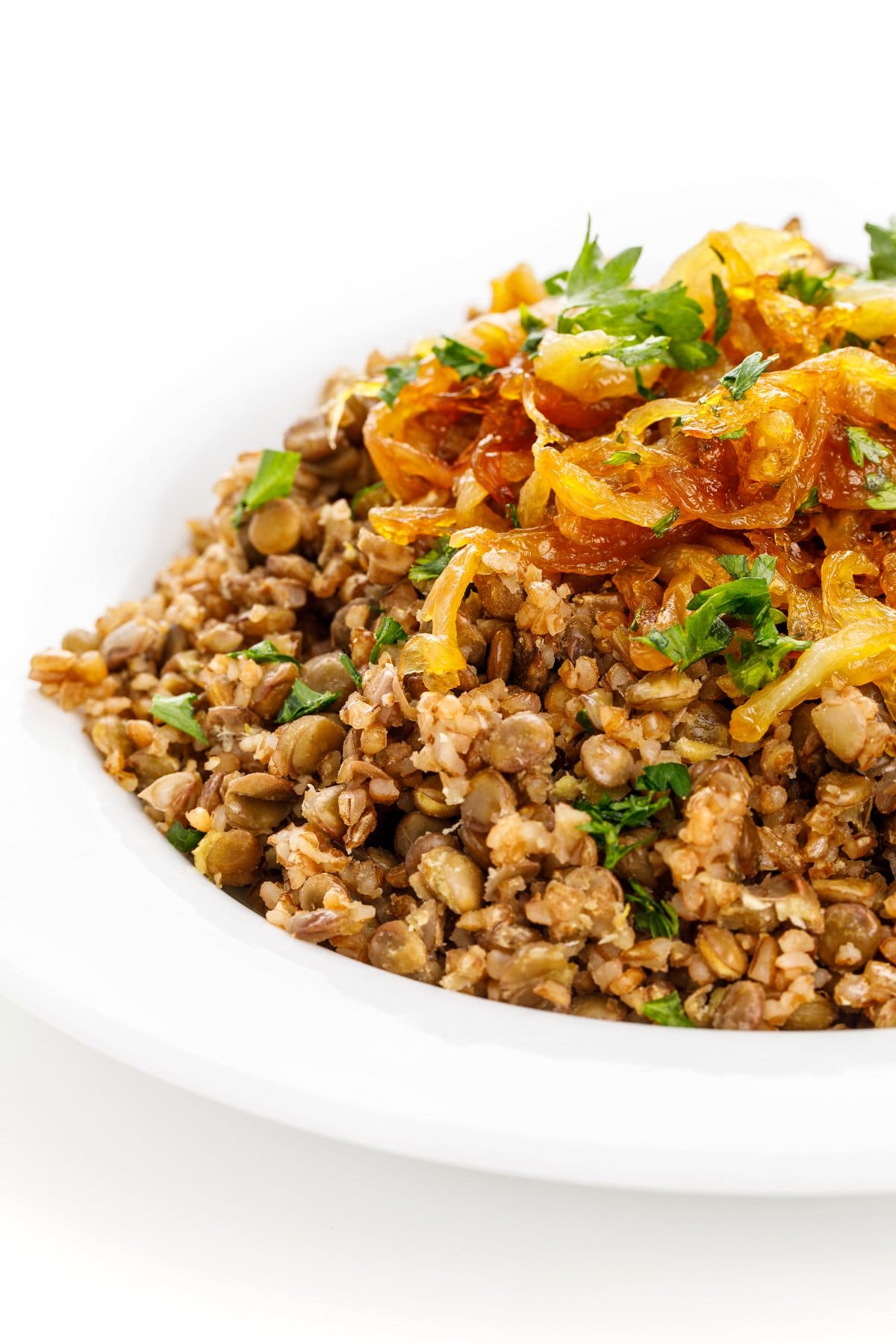 Lentils and bulgur wheat with caramelized onions is a delicious Middle Eastern dish. A great source of protein and fiber, it is also a tasty Vegetarian entree.