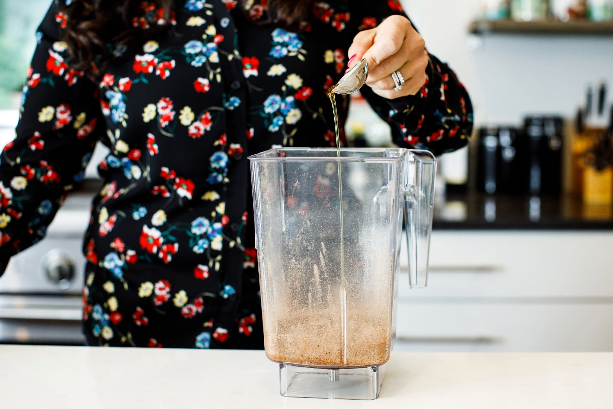 Step 2. Then add your maple syrup, peanut butter, and vanilla extract.