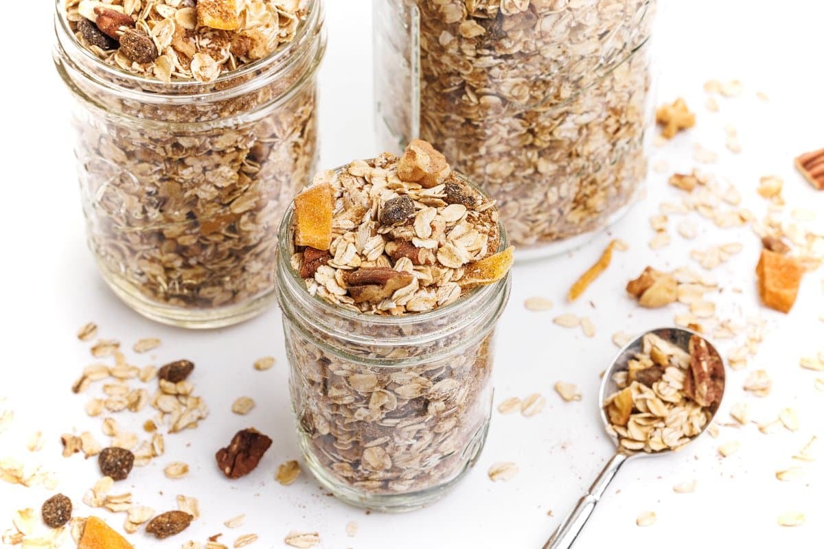 - In a large mixing bowl, combine all ingredients including toasted nuts. Store in an air-tight container for up to 3 weeks.8 cups old fashioned oats, 2 cups dried fruit, 1/2 cup brown sugar, 1/4 cup flax seed meal, 3 tablespoons cinnamon, 1 tablespoon salt, 1/2 tablespoon nutmeg, 1/4 tablespoon ground cloves