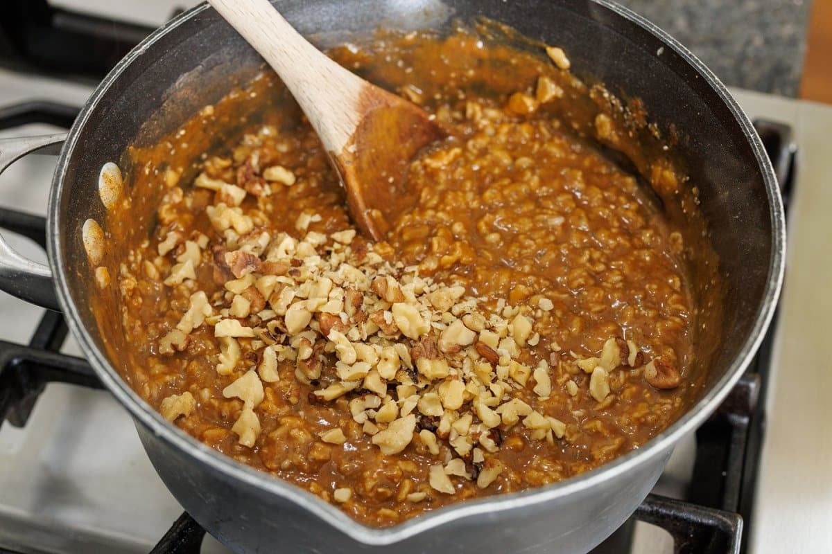 Stir in the chopped walnuts and chia seeds, and cook for an additional 2-3 minutes until warmed through.