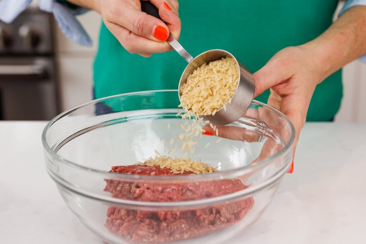 Step 1. Take your ground sirloin and add the rice to start you filling.