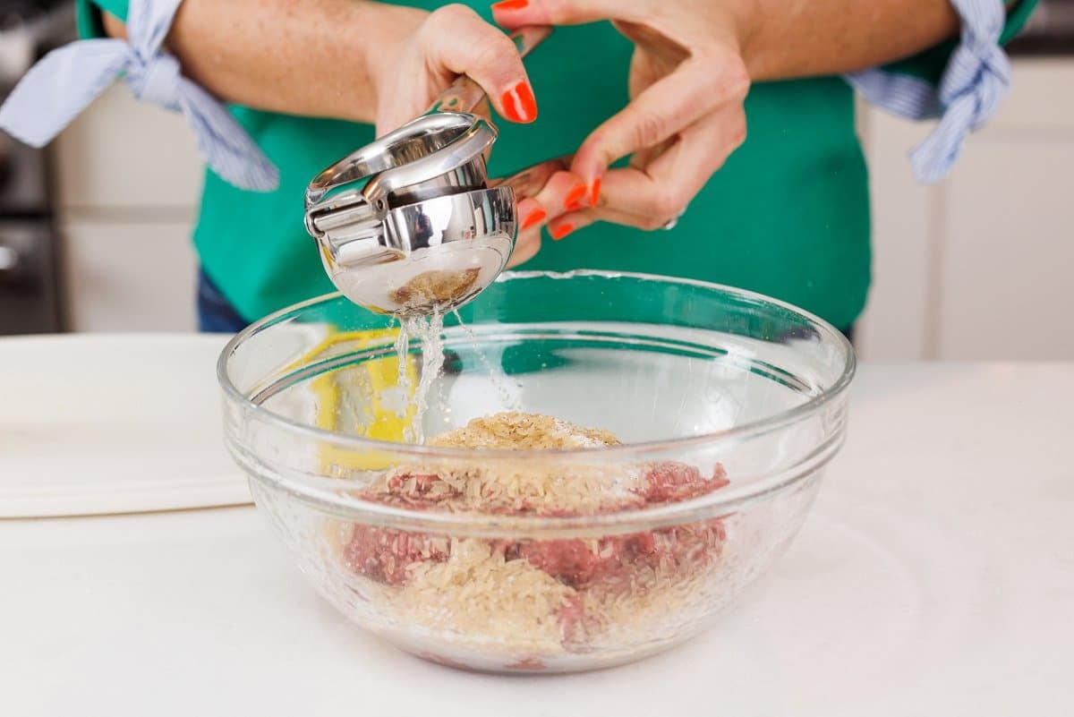 - In a large bowl, combine ground meat, rice, the juice of 1 lemon, salt and pepper.1 pound ground sirloin, 1/2 cup long grain enriched white rice, 1 teaspoon salt, 2 lemons, ¼ teaspoon pepper