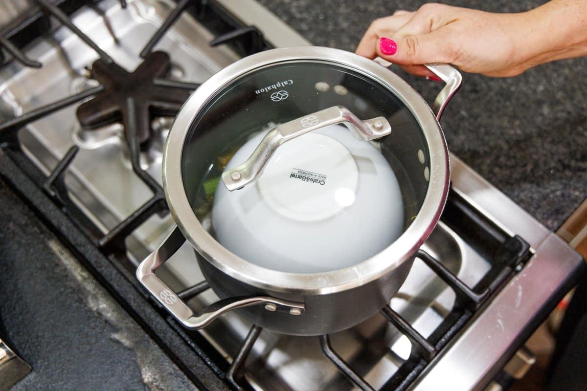 Step 7. Fill the pot with water, then use a glass plate or bowl that fits within the pot to hold the grape leaves in place submerged in the liquid.