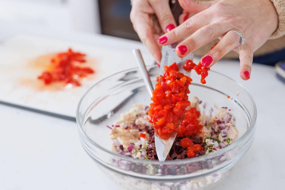 1. Place drained tuna in a medium bowl and add onion, mayonnaise, olives, roasted peppers, lemon juice and fresh basil. Stir with a fork until all ingredients are fully incorporated.