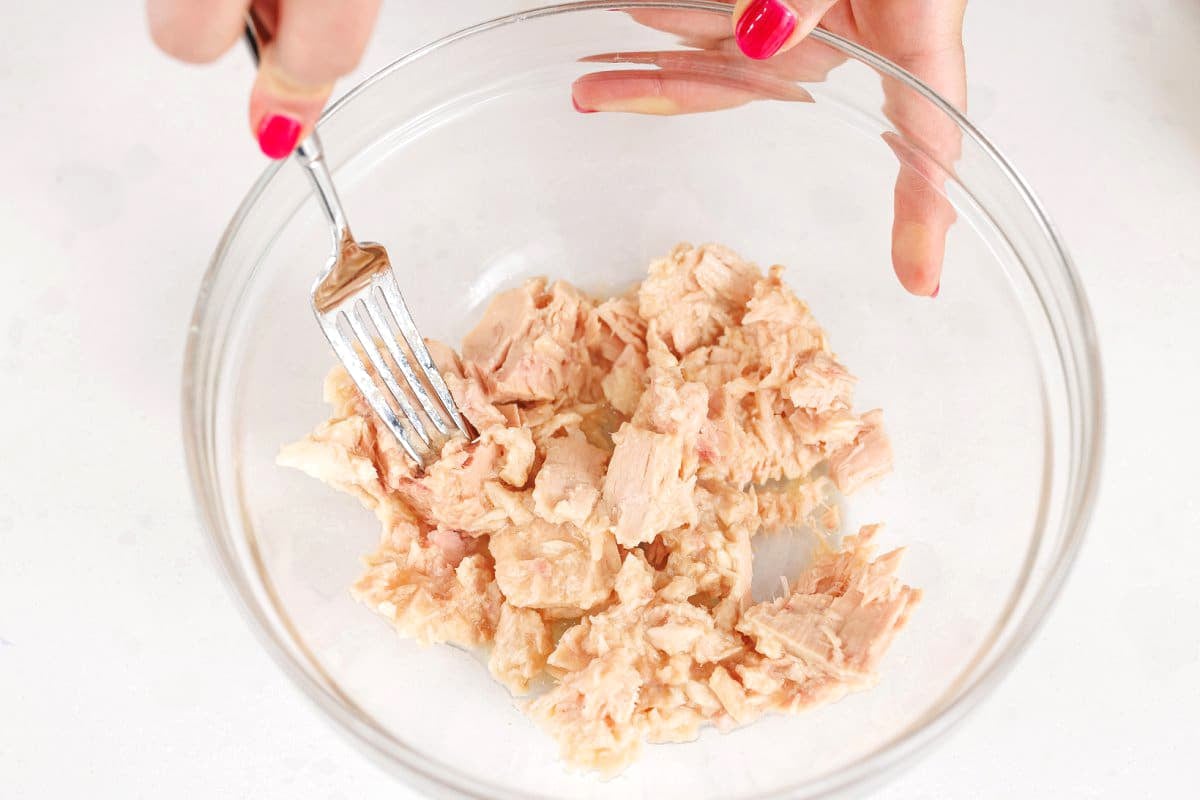 Then in a large bowl, add the drained tuna and break it up.