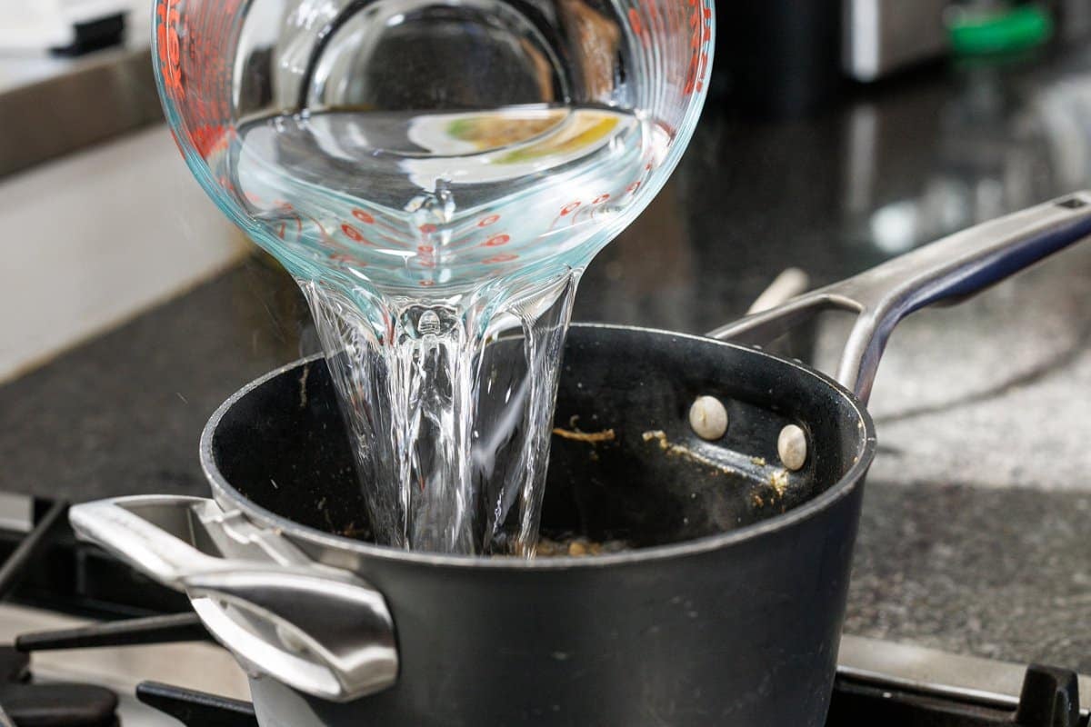 Then pour in the water. Bring to a boil, then lower the heat and simmer until the lentils are halfway done, about 15 minutes.