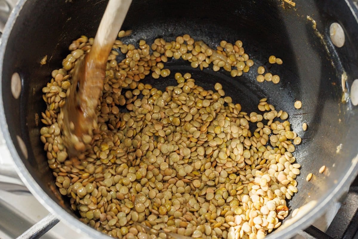 - In the same pan, add lentils and increase heat to medium-high. Toast lentils for 60 seconds then add 6 cups water. Bring pot to a boil then reduce heat to low and simmer until lentils are halfway cooked, about 15 minutes.