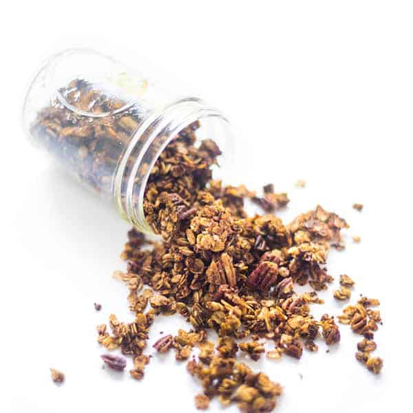 This molasses cookie granola recipe is made with hearty oats, crunchy pecans and warm spices like cinnamon, ginger and ground cloves.