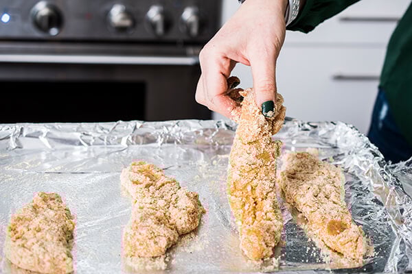 - Working one by one, dip each chicken tender into the egg wash to coat then place in the almond flour mix and move around until all sides are coated. Place in a single layer on baking sheet and repeat with remaining chicken.