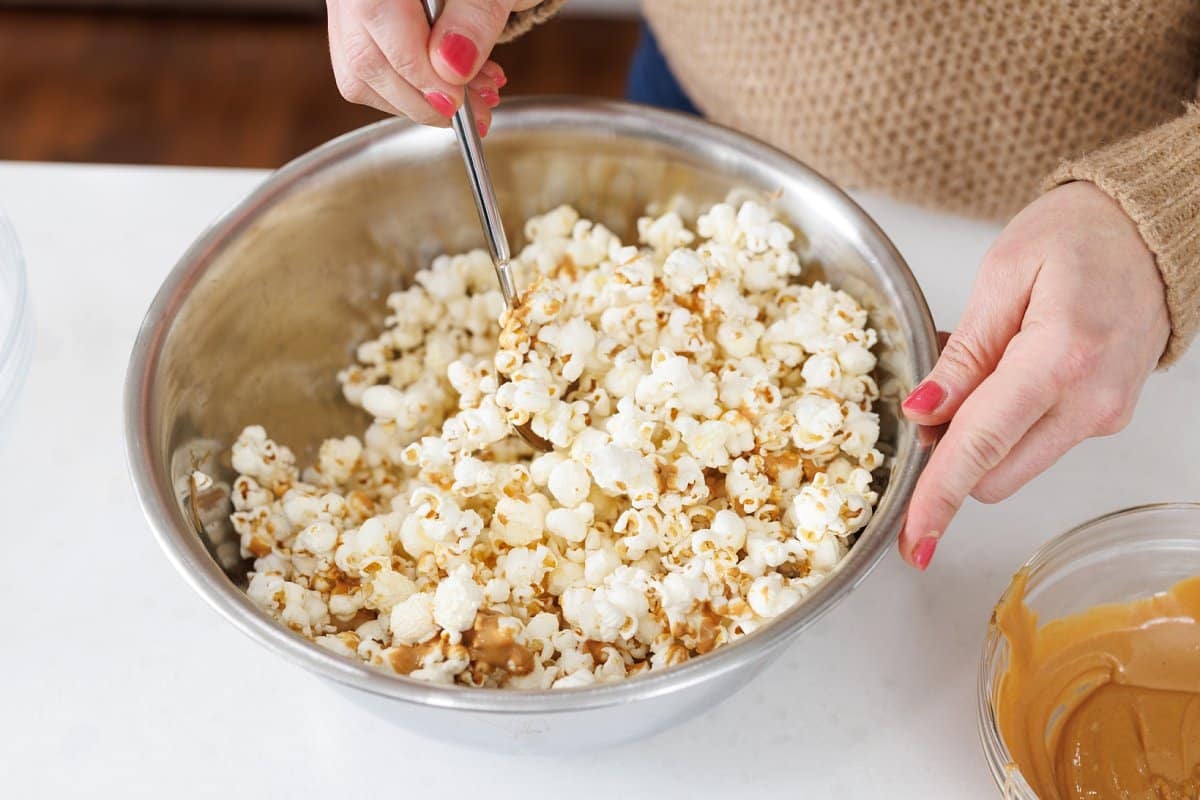 Put the peanut butter in a microwave safe bowl for about 30-40 seconds to melt it, then drizzle it over the top of the popcorn.