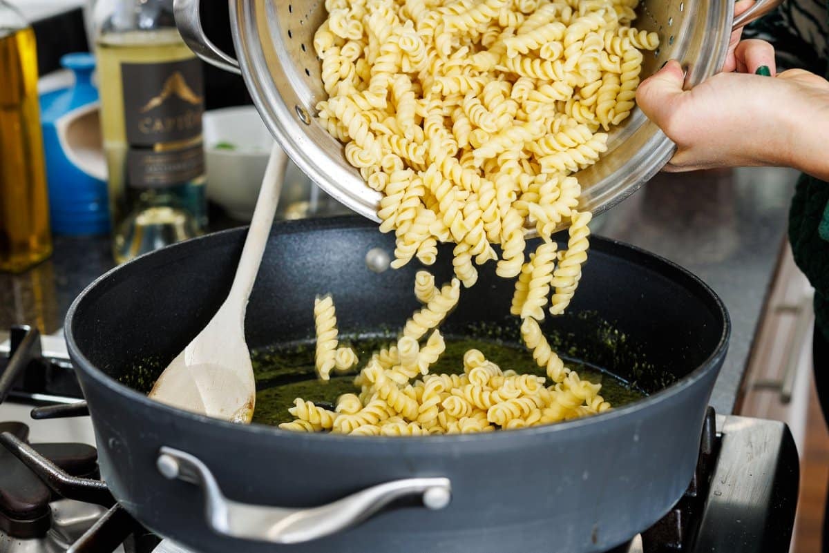 - In large, deep skillet, heat olive oil over medium heat then remaining 1/4 cup pesto and chili flakes. Heat until warmed through, about 1-2 minutes, before stirring in 1/2 cup of the starchy pasta water (reserving the rest in case you need it later.)