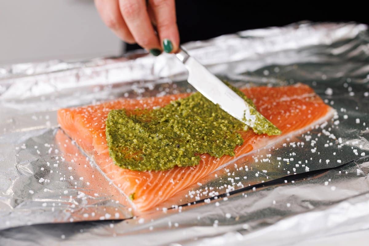 Next take a portion of the pesto and spread it over the top. Then throw it in the oven at 350 for about 15 minutes, until it flakes easily.
