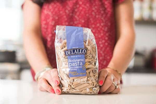 I’m especially excited about this Pesto Pasta with Shrimp and Peas because it is made with one of DeLallo’s newest products: Biodynamic Pasta. This unique type of pasta production uses the ancient practice of sustainable farming for its wheat which gives the pasta a hefty boost of nutrients, minerals and protein.