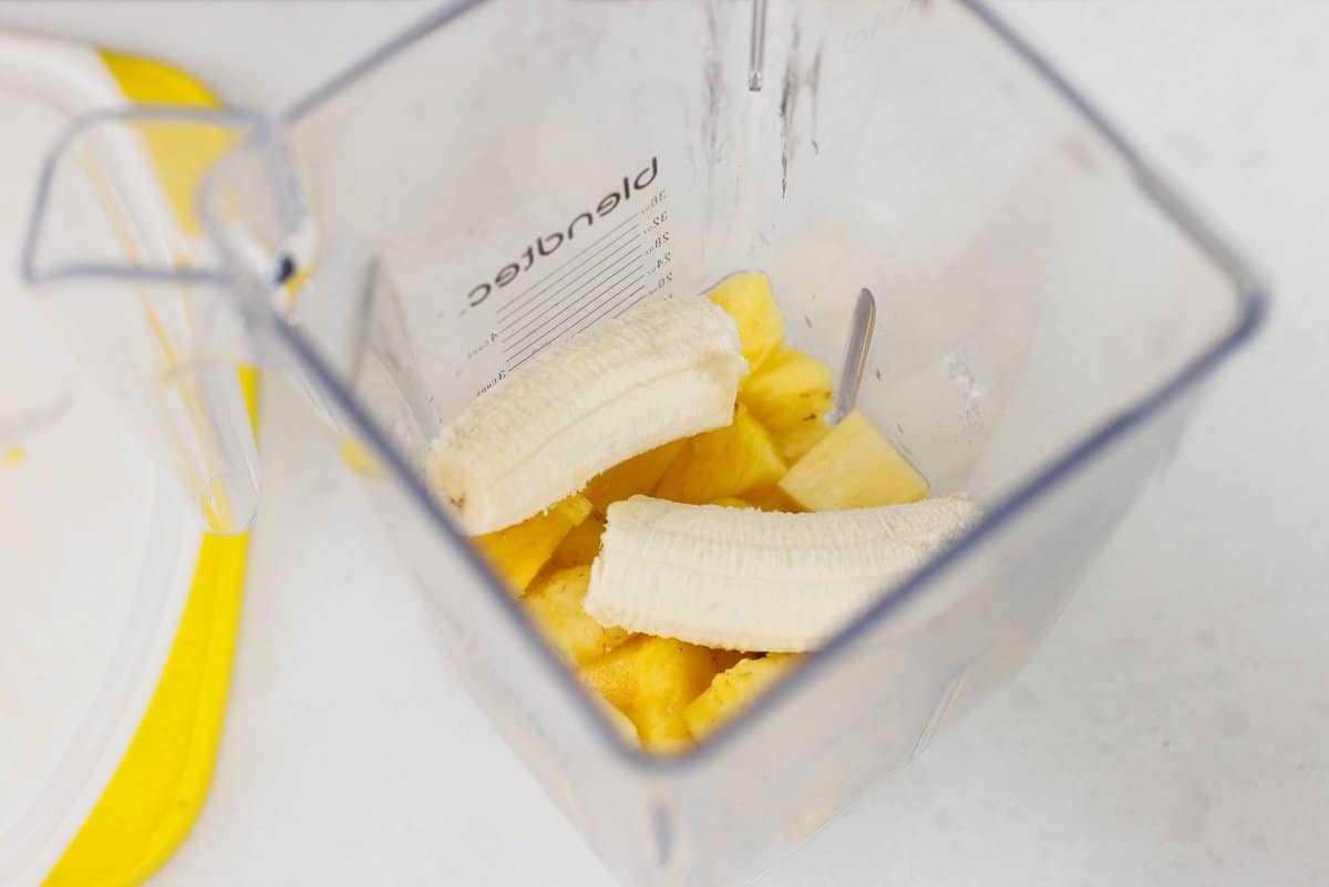 Then add your pineapple and banana to your blender. You can always use frozen fruit so you won’t have to add ice at the end.