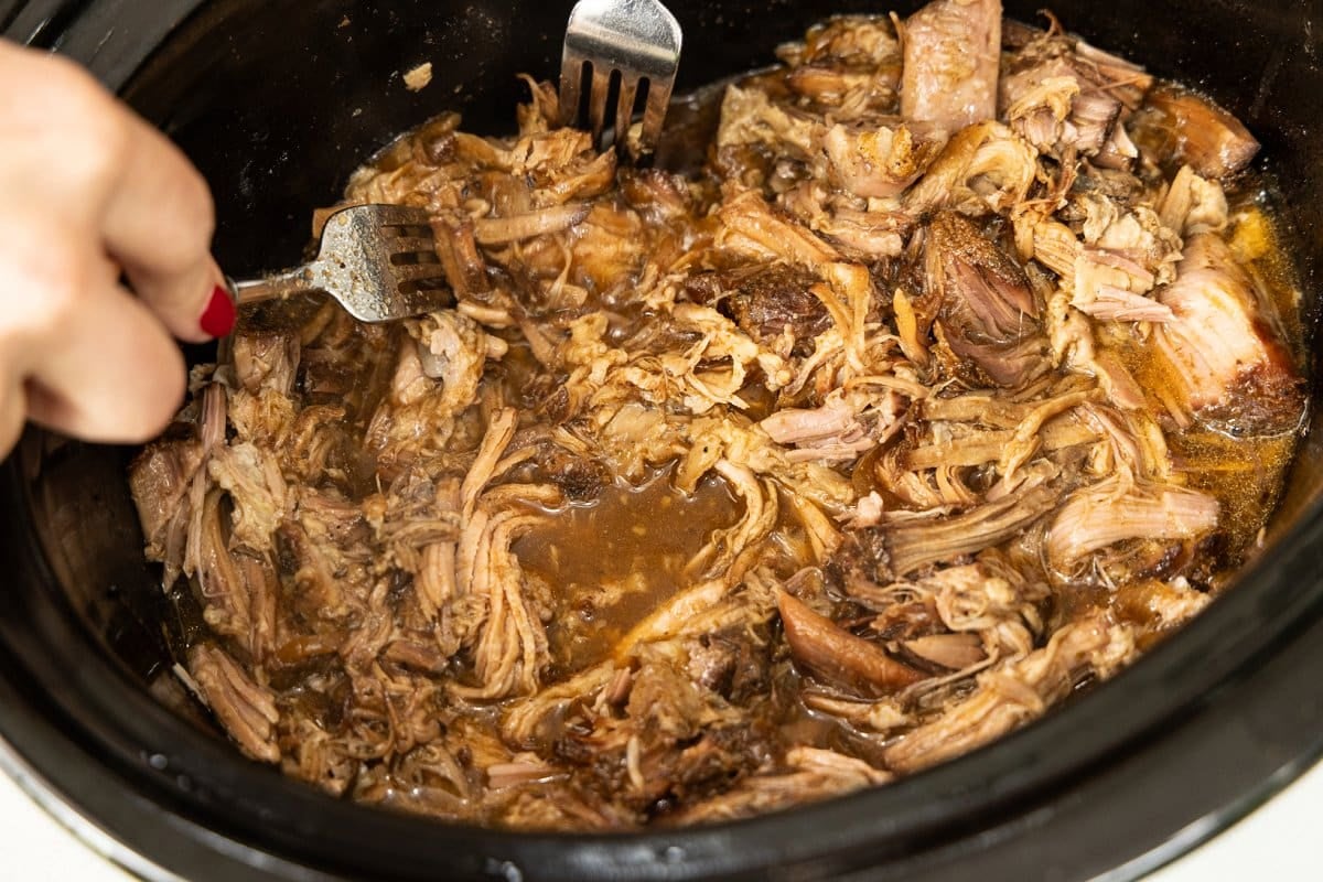 - Before serving, carefully shred pork with two forks, discarding any large chunks of excess fat.