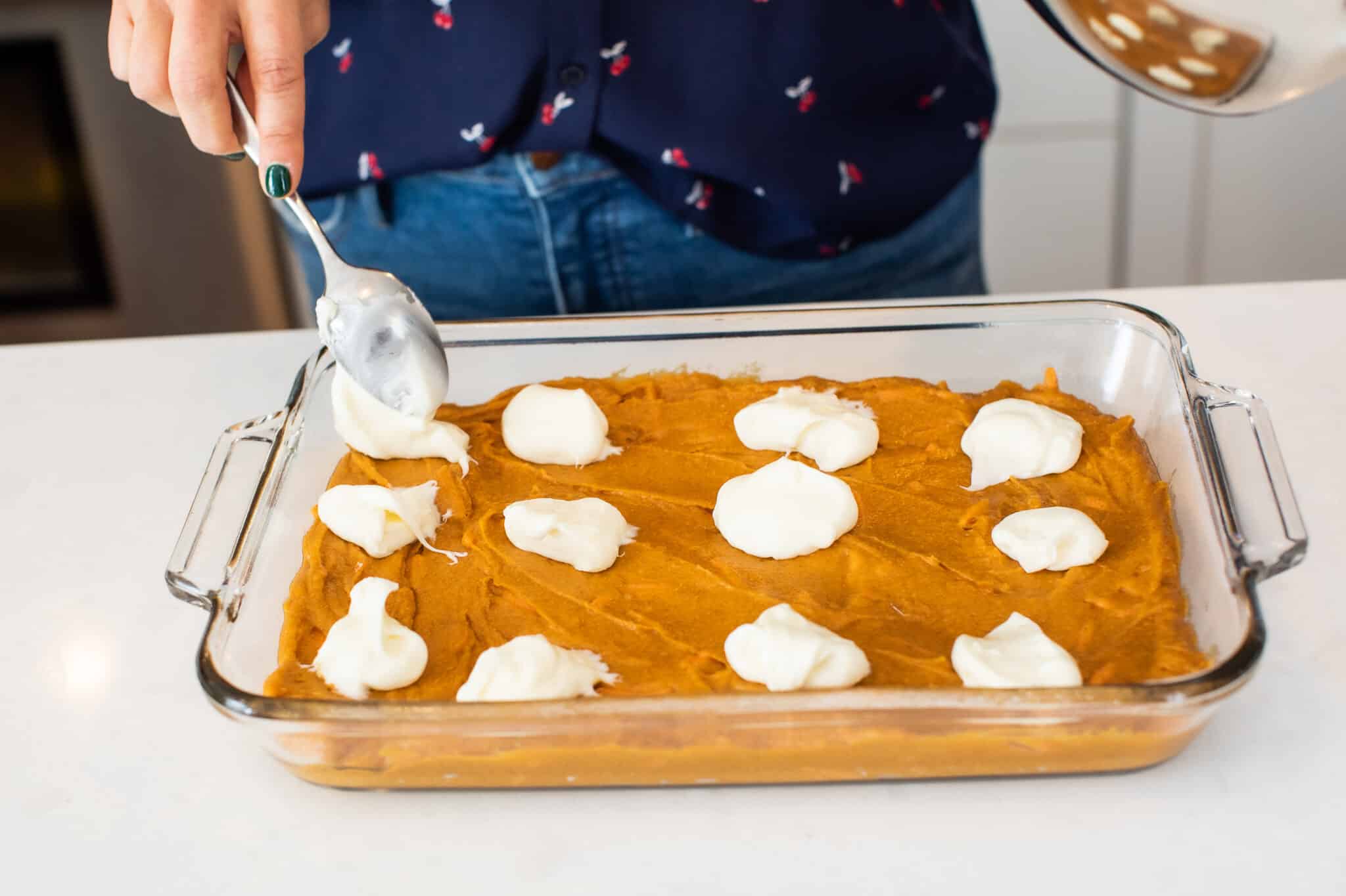 Then in a small bowl, whisk the cream cheese, sugar, and milk until smooth and combined. Using a spoon, dollop some of the cream cheese frosting evenly across the pumpkin mixture.