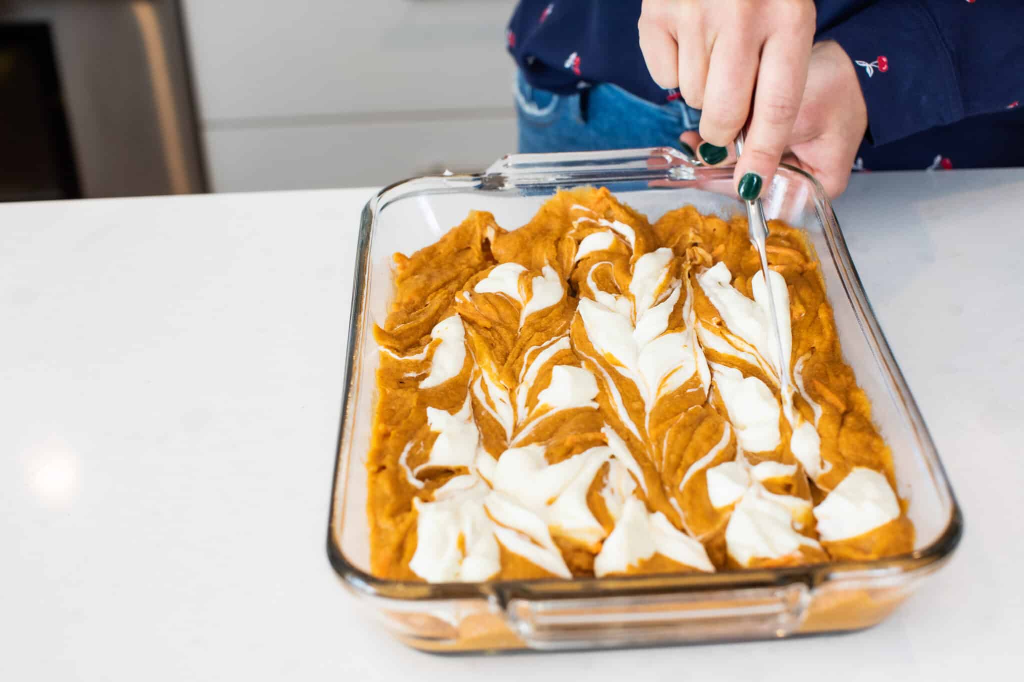 - Drop teaspoon-fulls of topping over pumpkin batter and swirl and cut mixture into batter with a butter knife.