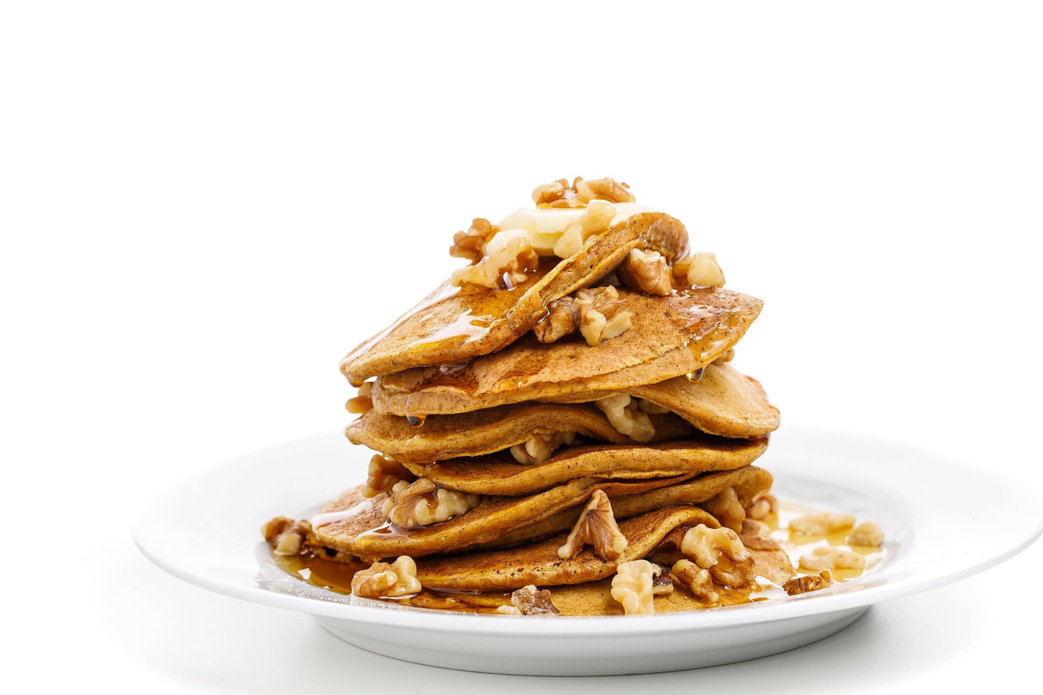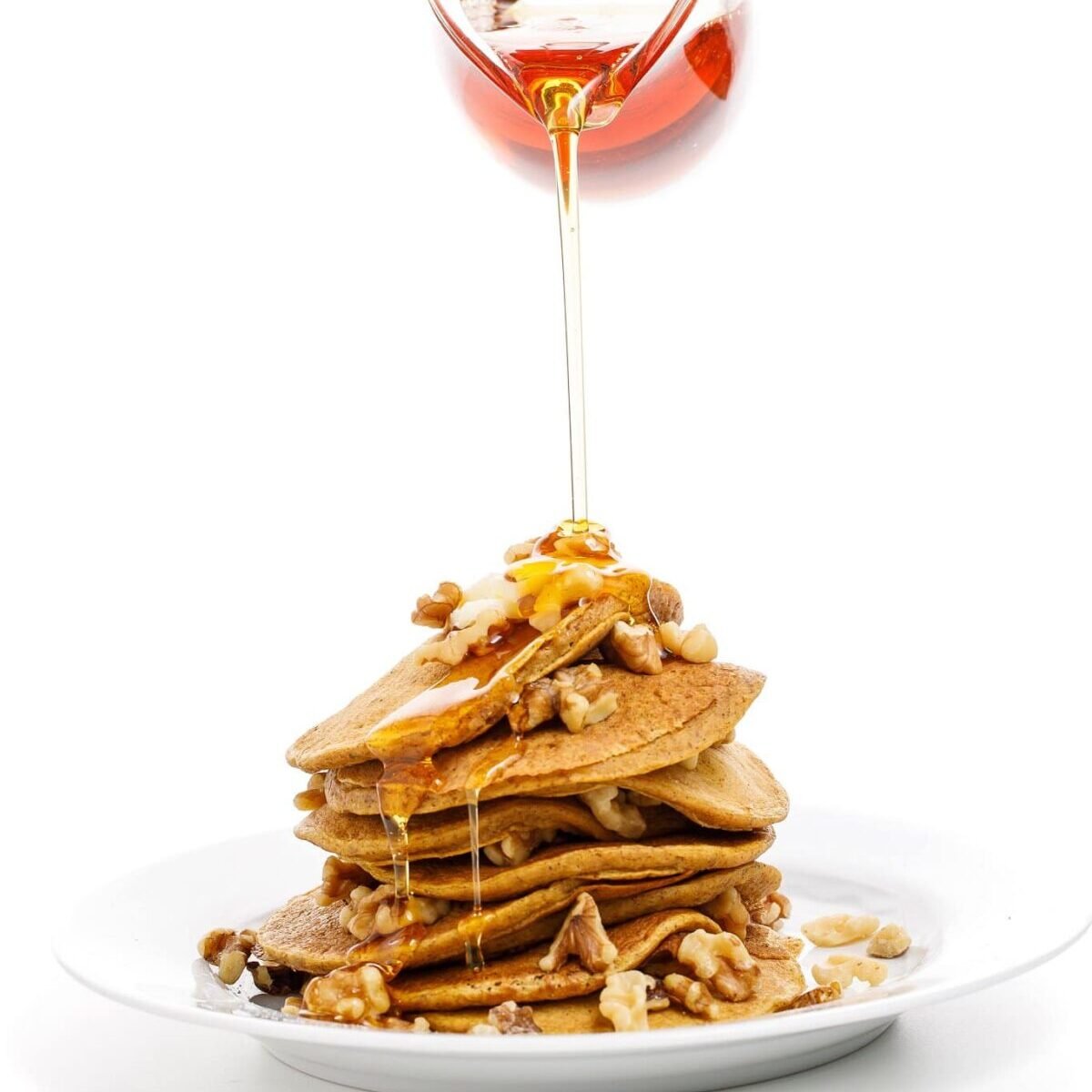 Personally, I love to top the whole stack with chopped pecans in order to add protein and texture. However, walnuts or sliced almonds are delicious, too! Feel free to add fruit, nuts and seeds, nut butters, or whipped cream!