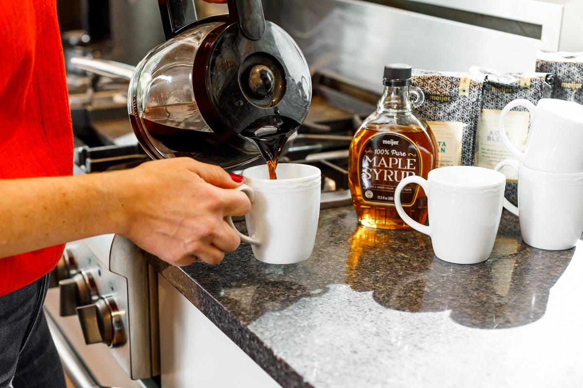- While the coffee is brewing, whisk together pumpkin pie spice, maple syrup, vanilla and milk in a small sauce pot over medium heat. Continue whisking until bubbles start to form around the edges.