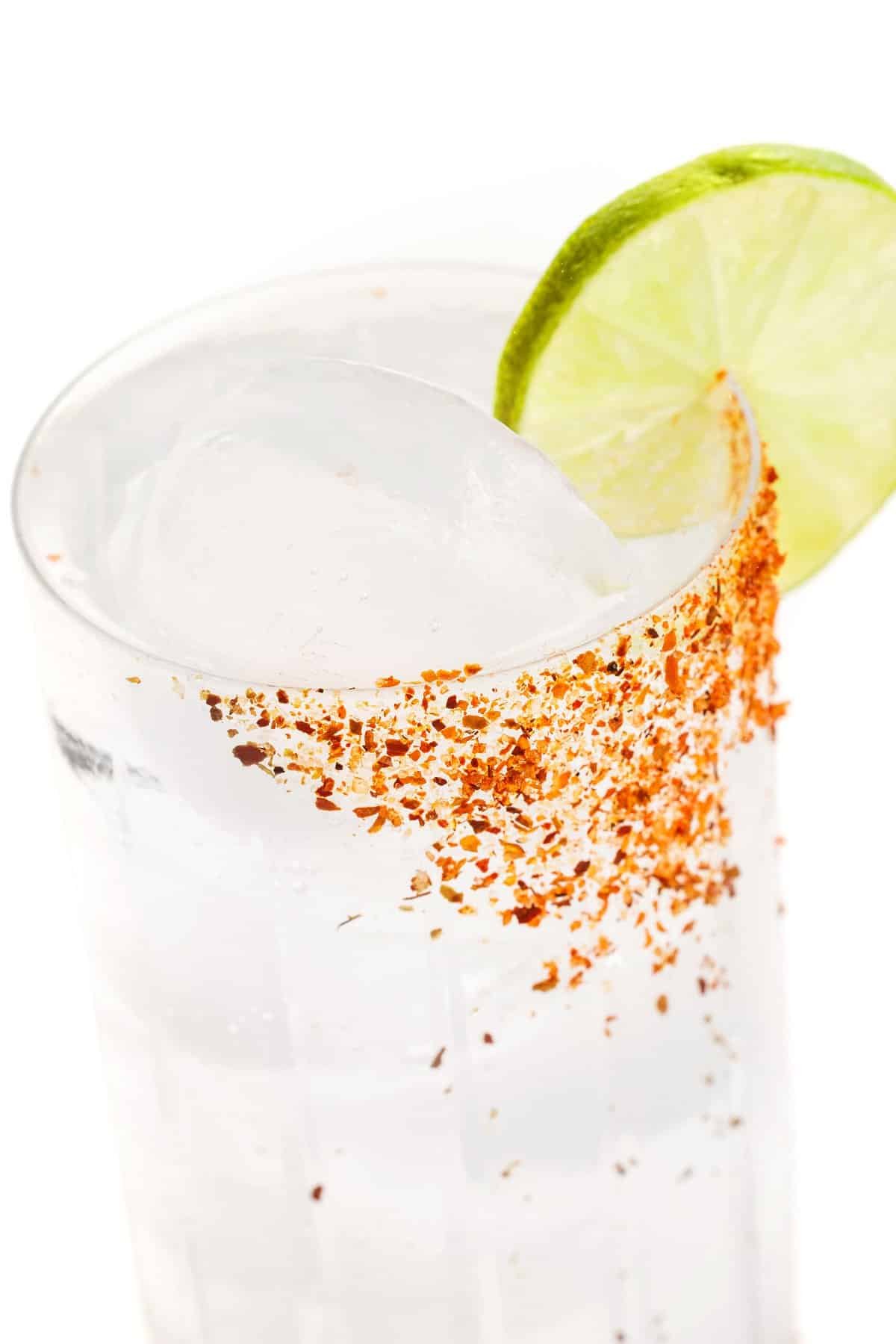 - To rim the glasses, gently moisten the rim of four glasses with a lime wedge. Pour about ¼ cup of tajin on a plate then gently move the moistened rim around to coat with the salt. Fill each glass with ice then set aside.