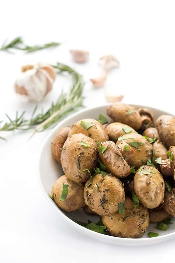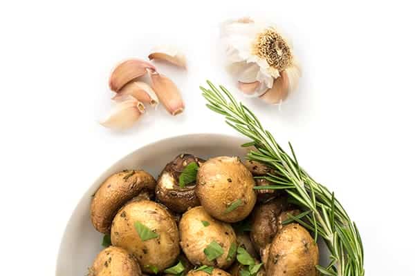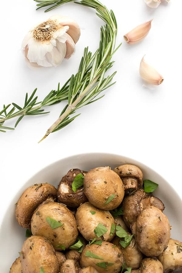 A lighter version of the steakhouse classic, mushrooms are roasted until brown and caramelized in a little olive oil then tossed with fresh minced garlic and rosemary.