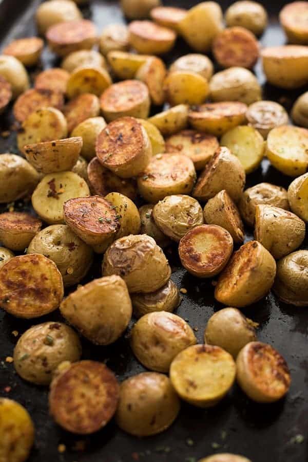 - Skatter potato halves on the baking sheet then toss well with olive oil, rosemary, garlic and salt. Roast until crispy, about 45-50 minutes, tossing once halfway through.