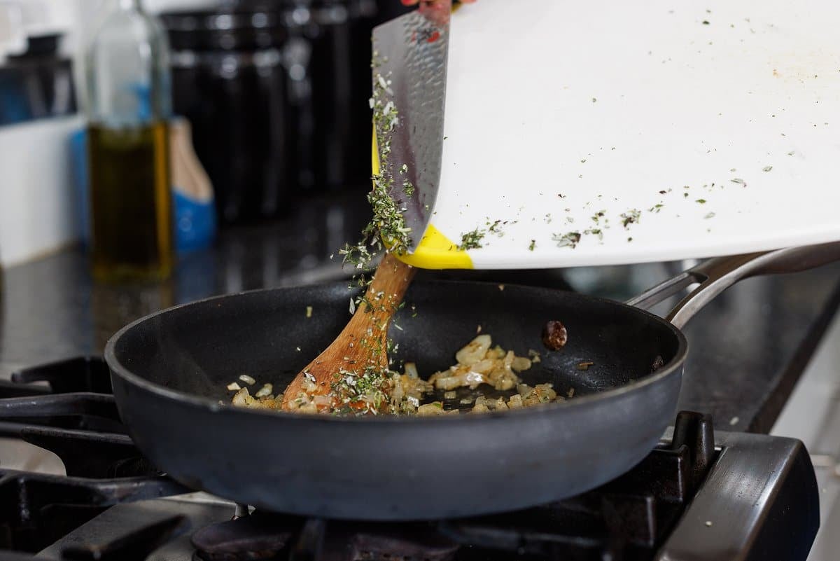 - Bring olive oil to a medium high heat in a pan then saute onions with fresh rosemary, thyme and a pinch of salt and pepper until translucent (5-7 minutes.)1 tablespoon extra virgin olive oil, 1 cup onion, 1 tablespoon fresh rosemary, 1 teaspoon dried thyme