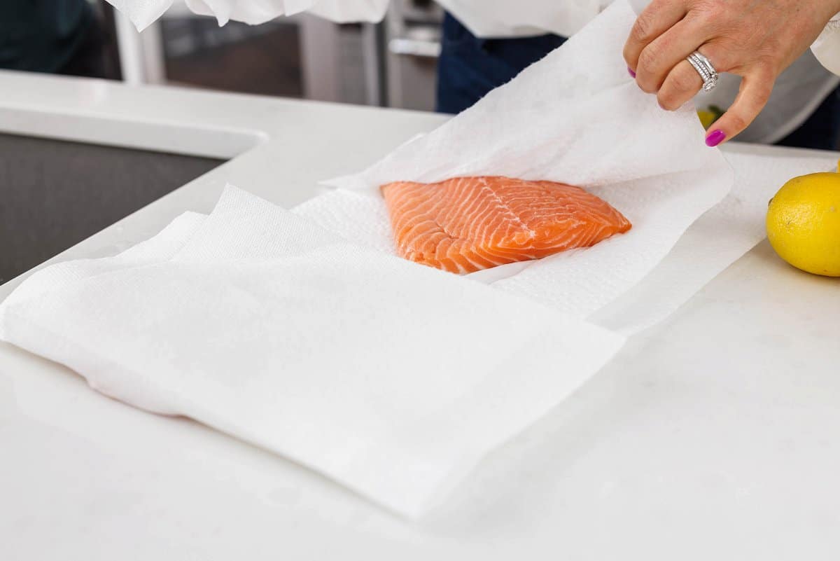 Start your Salmon with Lemon and Oregano by patting your salmon dry and laying the fillets on a prepared sheet pan or grill plate.